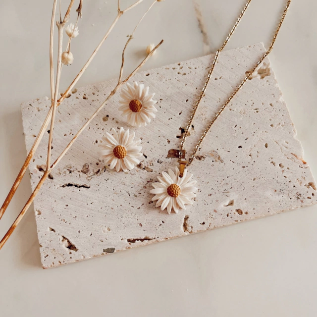 Itens do conjunto: Colar de 25cm de comprimento + par de brincos margarida.